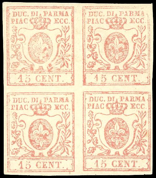 1859 - 15 cent. vermiglio (9), blocco di quattro, nuovo, gomma originale, leggera traccia di linguella, perfetto e molto fresco. Fiecchi, Ferrario.