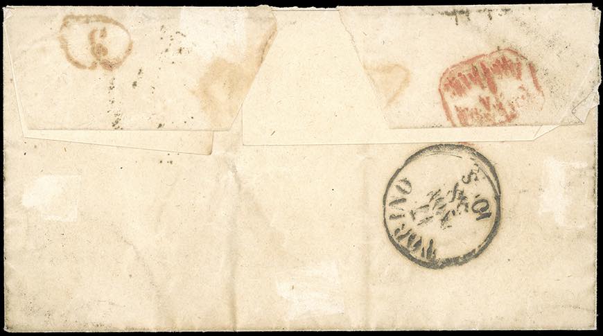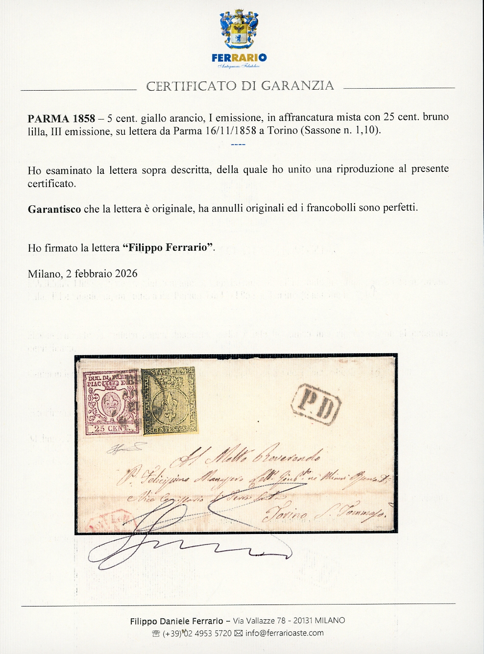 1858 - 5 cent. giallo arancio, I emissione, in affrancatura mista con 25 cent. bruno lilla, III emissione (1,10), perfetti, su lettera da Parma 16/11/1858 a Torino. Cert. Ferrario.