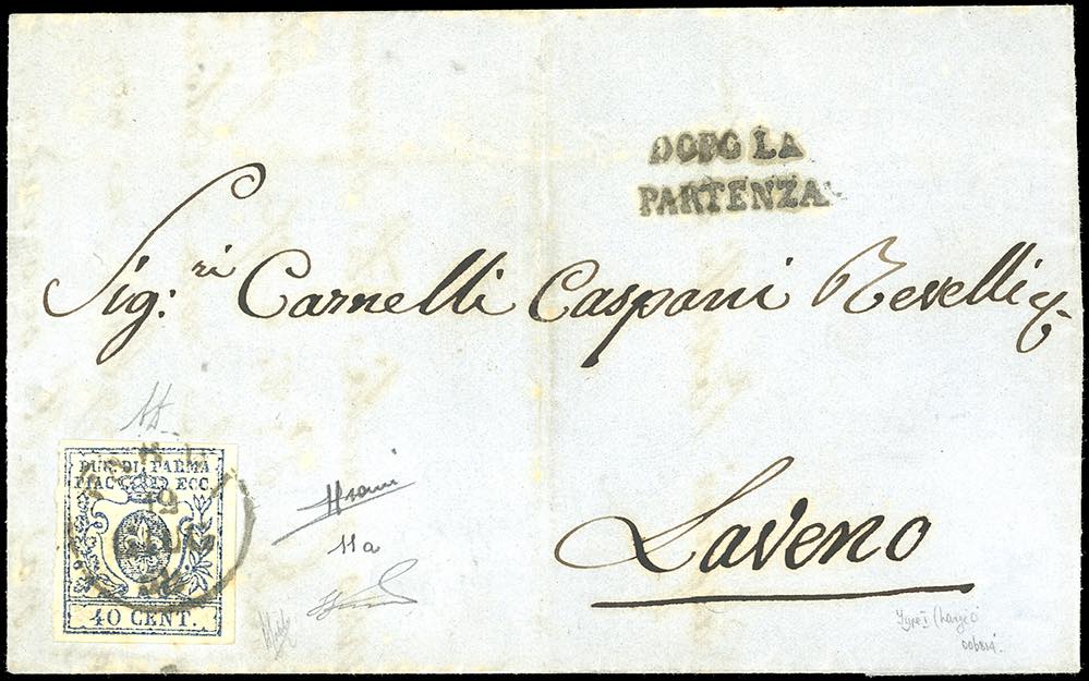 1858 - 40 cent. azzurro, I tipo, zero largo, stampa difettosa (11a), perfetto, isolato su lettera da Parma 12/6/1858 a Laveno. Sorani, A.Diena, cert. Ferrario.