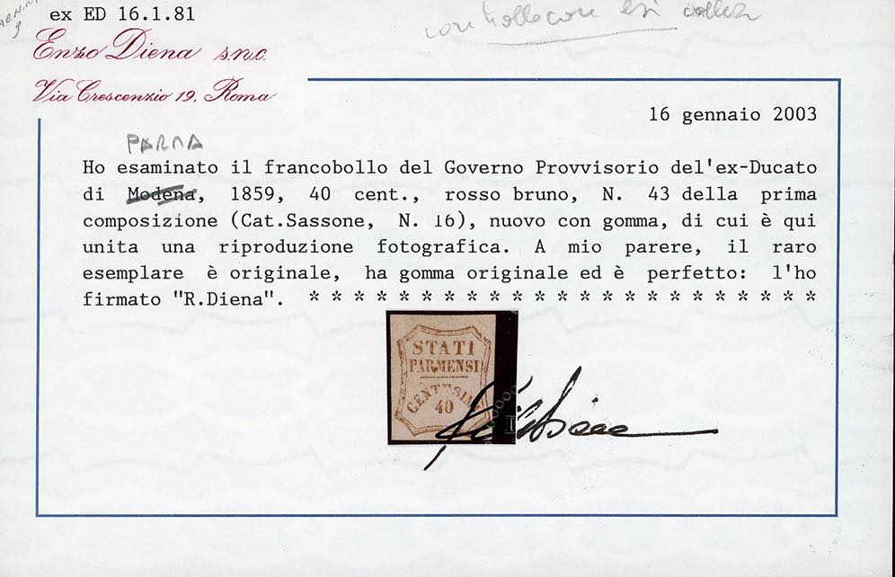Lotto 232 - 1859 - 40 cent. rosso bruno, I composizione (16), nuovo, ...