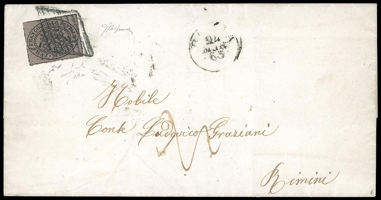 1865 - 1/2 baj violetto (1Aa), perfetto, isolato su circolare da Roma 24/3/1865 a Rimini, tassata. Fiecchi, Chiavarello, Ghiglione.