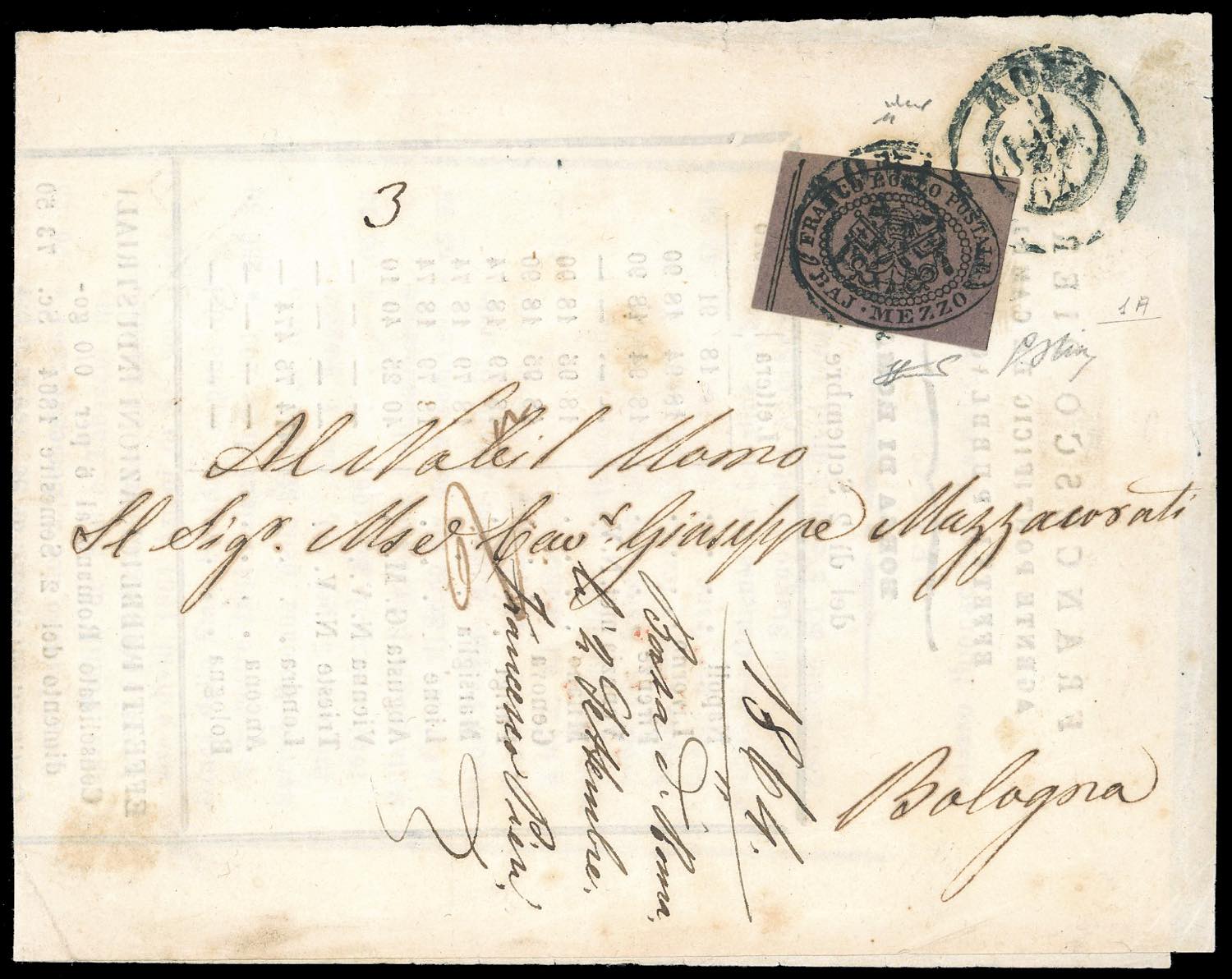 1853 - 1 baj verde grigiastro (2), blocco di quattro con interspazio orizzontale di gruppo al centro, perfetto e con filetti completi su tutti i lati, e quattro esemplari singoli, al verso di fresca lettera di otto porti, in porto assegnato, da Perugia 31/3/1853, francobolli annullati con il muto a griglietta, a Marsciano. UNICA AFFRANCATURA COSI' COMPOSTA FINORA NOTA, di eccezionale impatto visivo. Rarità da esposizione. G.Oliva, A.Diena, cert. E.Diena e Ferrario. Ex coll. Imperato.