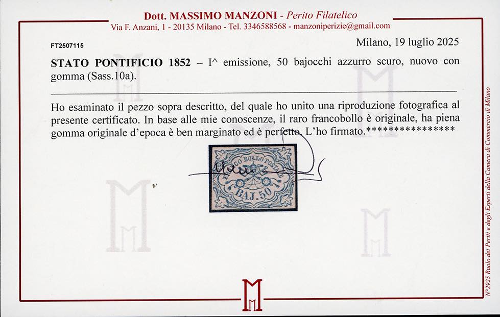1852 - 50 baj azzurro scuro (10a), nuovo, ottimi margini, gomma originale, perfetto. Fresco e molto raro così ben marginato. Cert. Manzoni, Alberto Diena e Ferrario.