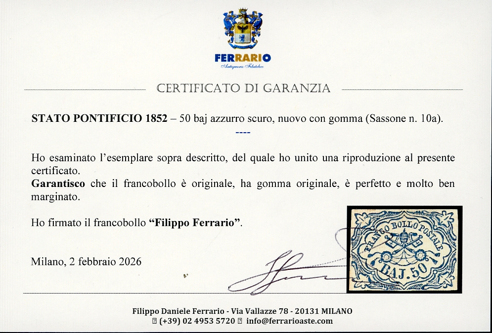 1852 - 50 baj azzurro scuro (10a), nuovo, ottimi margini, gomma originale, perfetto. Fresco e molto raro così ben marginato. Cert. ... Leggi tutto