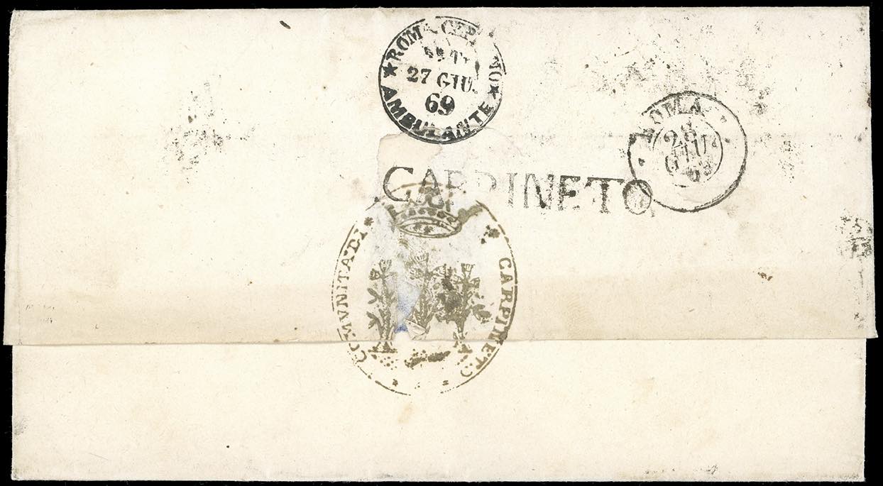 CARPINETO, SD punti 12 - 10 cent. (26), coppia orizzontale, perfetta su lettera del 27/6/1869, datario di Segni sul fronte per Roma. Bella. ... Leggi tutto