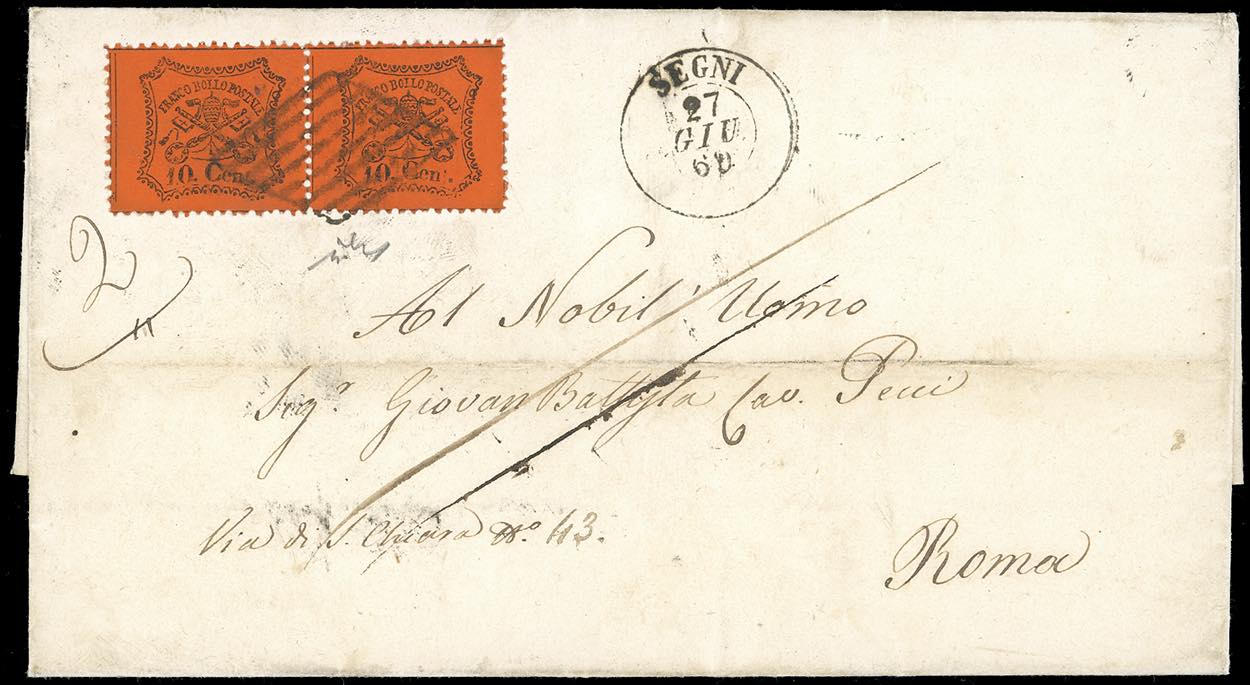 CARPINETO, SD punti 12 - 10 cent. (26), coppia orizzontale, perfetta su lettera del 27/6/1869, datario di Segni sul fronte per Roma. Bella. Chiavarello.