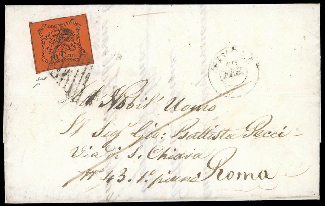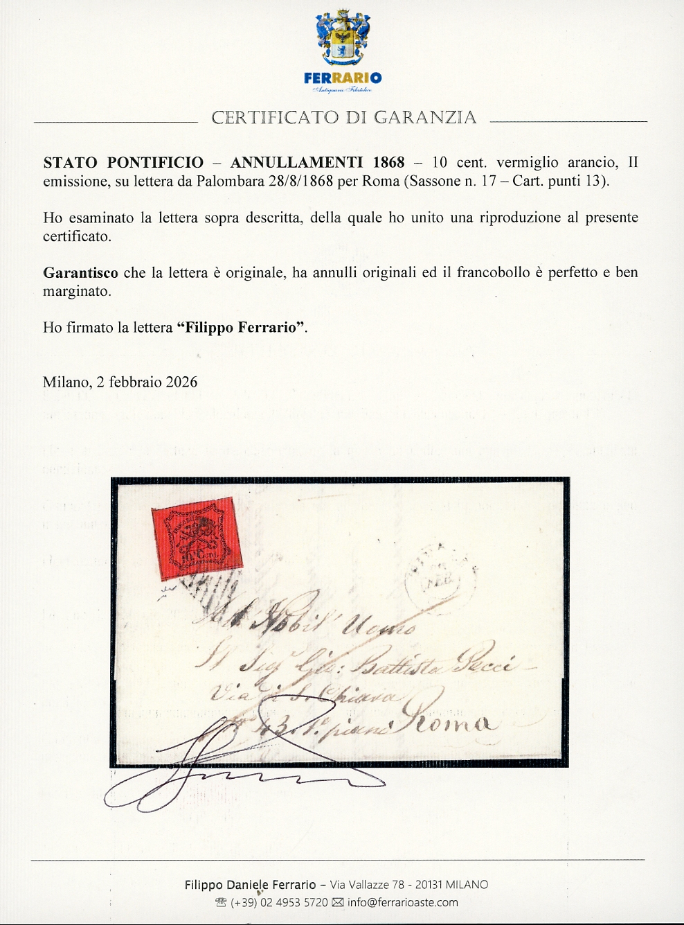 PALOMBARA, Cart. punti 13 - 10 cent. (17), perfetto e ben marginato, su fresca lettera del 28/8/1868 per Roma. Chiavarello, cert. Ferrario.