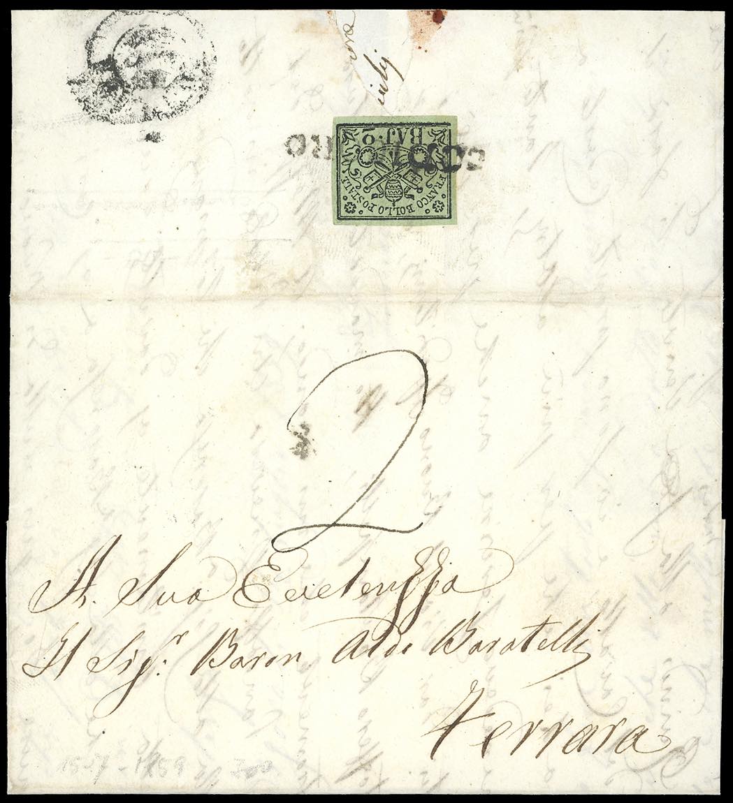 1859 - Lettera di doppio porto, in porto assegnato, da Codigoro a Ferrara del 14/7/1859, tassata al verso con 2 baj (3), sul fronte segno di tassa 2. Affrancatura al verso non censita dal Catalogo Sassone.