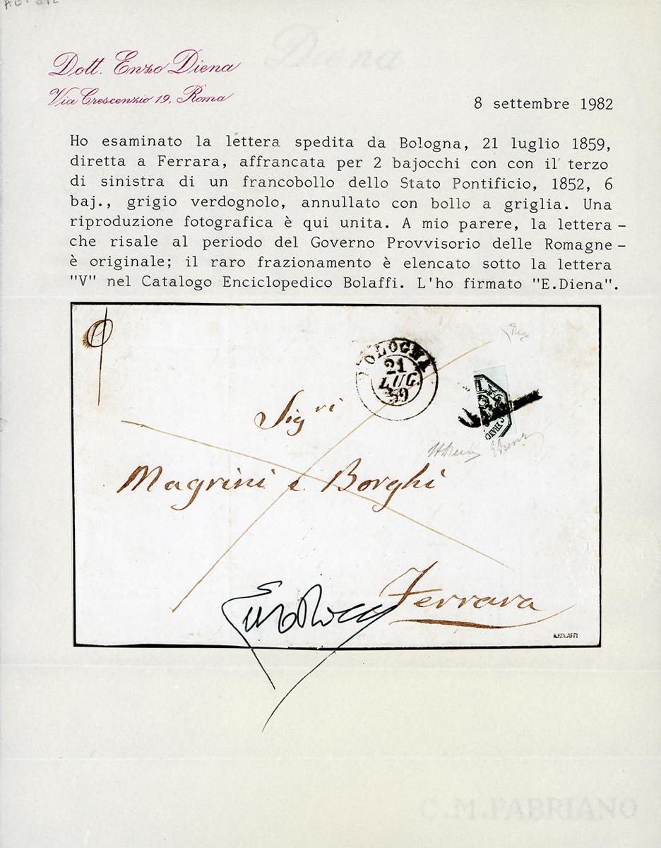 1859 - Lettera da Bologna a Ferrara del 21/7/1859 affrancata con 6 baj grigio verdastro (7) frazionato ad 1/3 per assolvere la tariffa di 2 baj. Rara. Emilio ed Alberto Diena, cert. Enzo Diena.