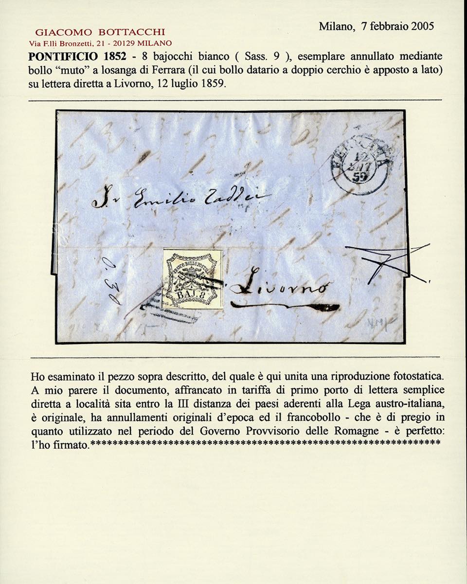 1859 - 8 baj bianco (9), perfetto, su lettera, indirizzo in parte restaurato, da Ferrara 12/7/1859 (mese nel datario capovolto) a Livorno, nel Governo Provvisorio di Toscana. Cert. Bottacchi.