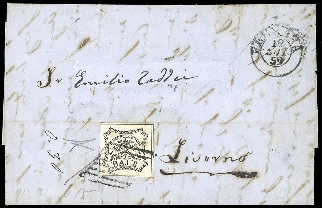 1859 - 8 baj bianco (9), perfetto, su lettera, indirizzo in parte restaurato, da Ferrara 12/7/1859 (mese nel datario capovolto) a Livorno, ... Leggi tutto