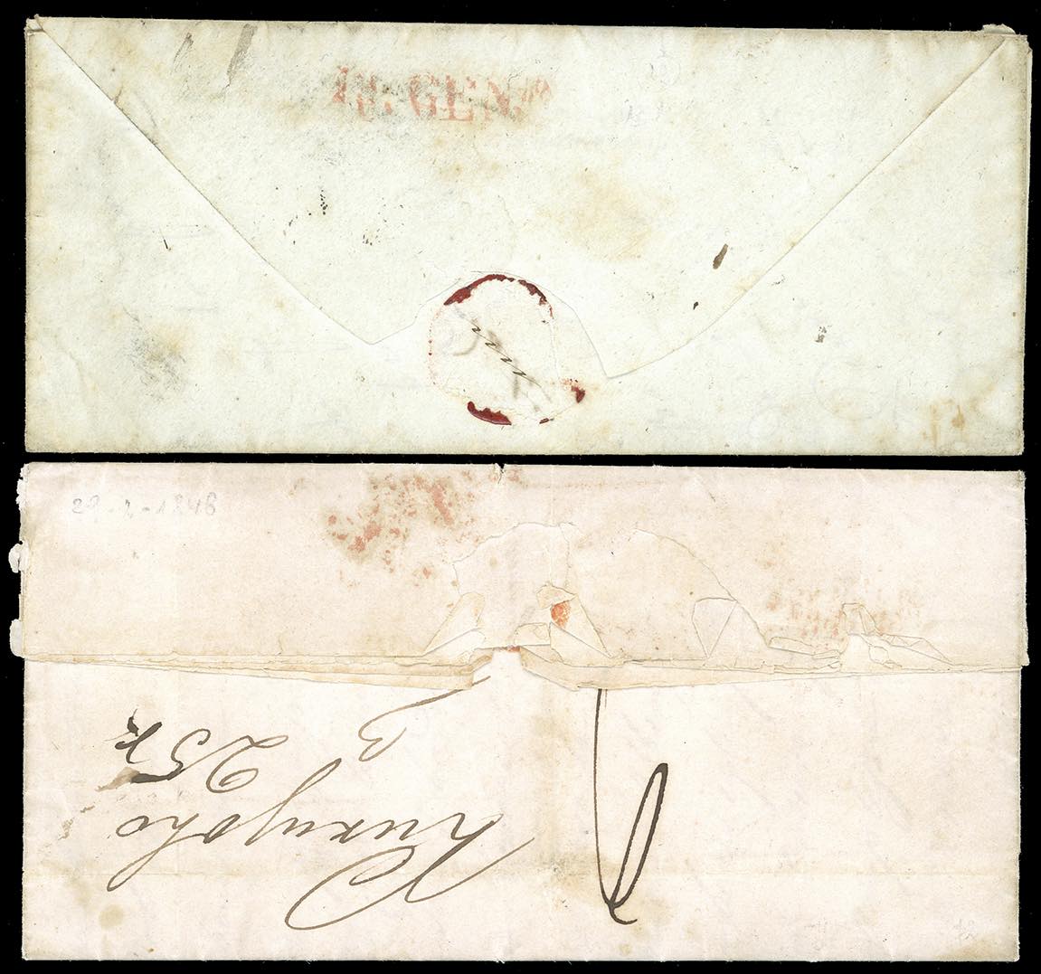 1848 - Lettera prefilatelica da Genova 29/2/1848 a Kerteh, in Malesia, sul fronte lineare su due righe in rosso "dopo la partenza" e segno di tassa, al verso manoscritti i 60 cent. pagati in partenza. Allegata un'altra lettera scritta a Kerteh 17/11/1848, affidata al capitano di un brigantino di passaggio in Malesia, e sbarcato a Genova, dove il 13/1/1848 fu affidata alla posta per essere recapitata in città, tassazione 10 cent. sul fronte. Destinazione ed incoming mail di straordinaria rarità e fascino, insieme probabilmente unico. Da esposizione!