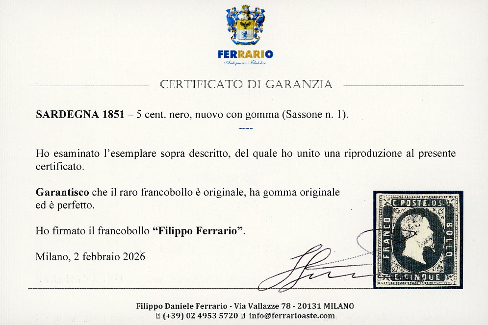 1851 - 5 cent. nero (1), nuovo, gomma originale, perfetto e ben marginato. Bello e molto fresco. Cert. A.Diena e Ferrario.