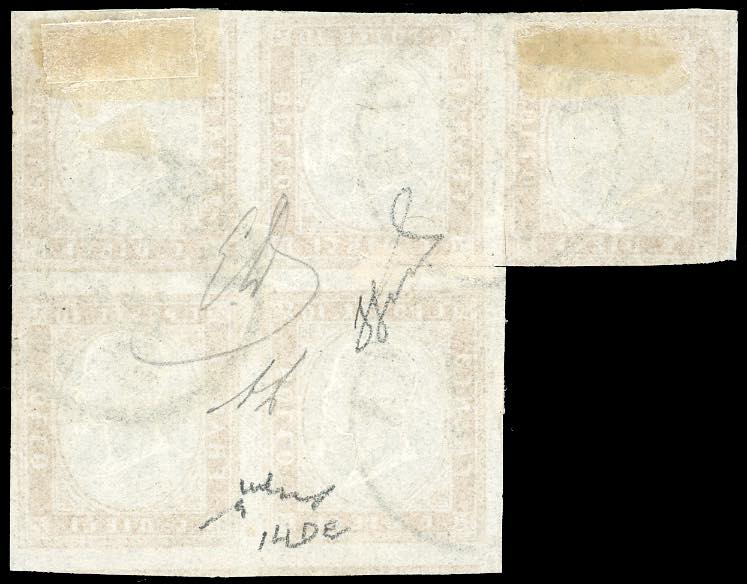 1862 - 10 cent. arancio ocra (14De), blocco di cinque, alcuni lievi difetti di marginatura, usato a Piazza 23/2/1863, ottimo aspetto. Raro. Em. e A.Diena, Chiavarello, cert. Ferrario.