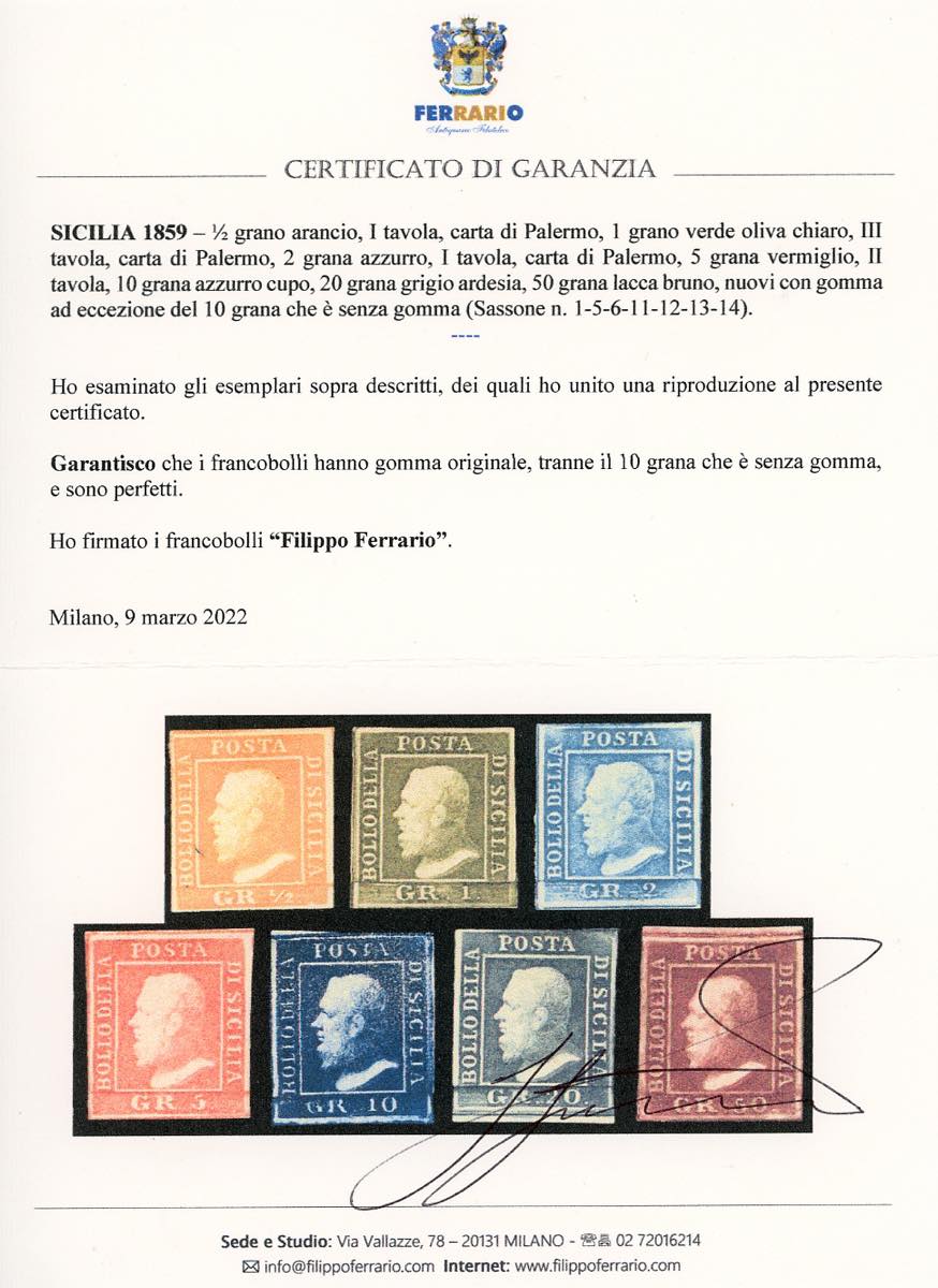 1859 - L'emissione completa di 7 valori nelle tavole più comuni (1,5,6,11,12,13,14), nuovi, gomma originale, perfetti. Il 10 grana senza gomma. Ottima qualità. Tutti firmati da noti periti, la serie cert. Ferrario.
