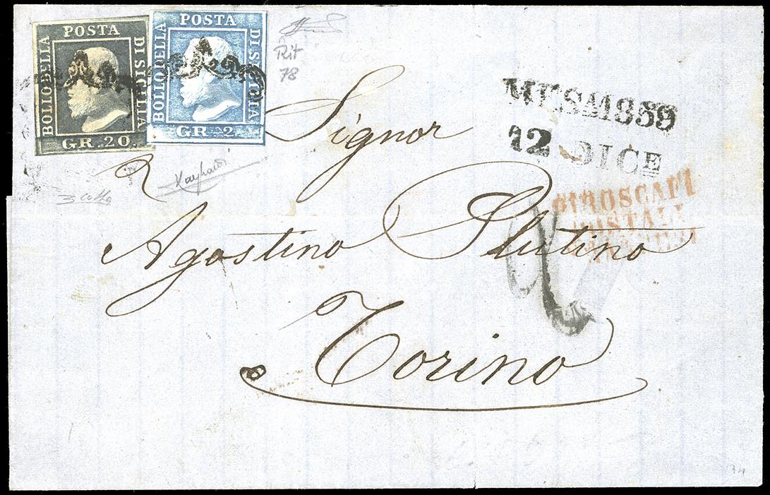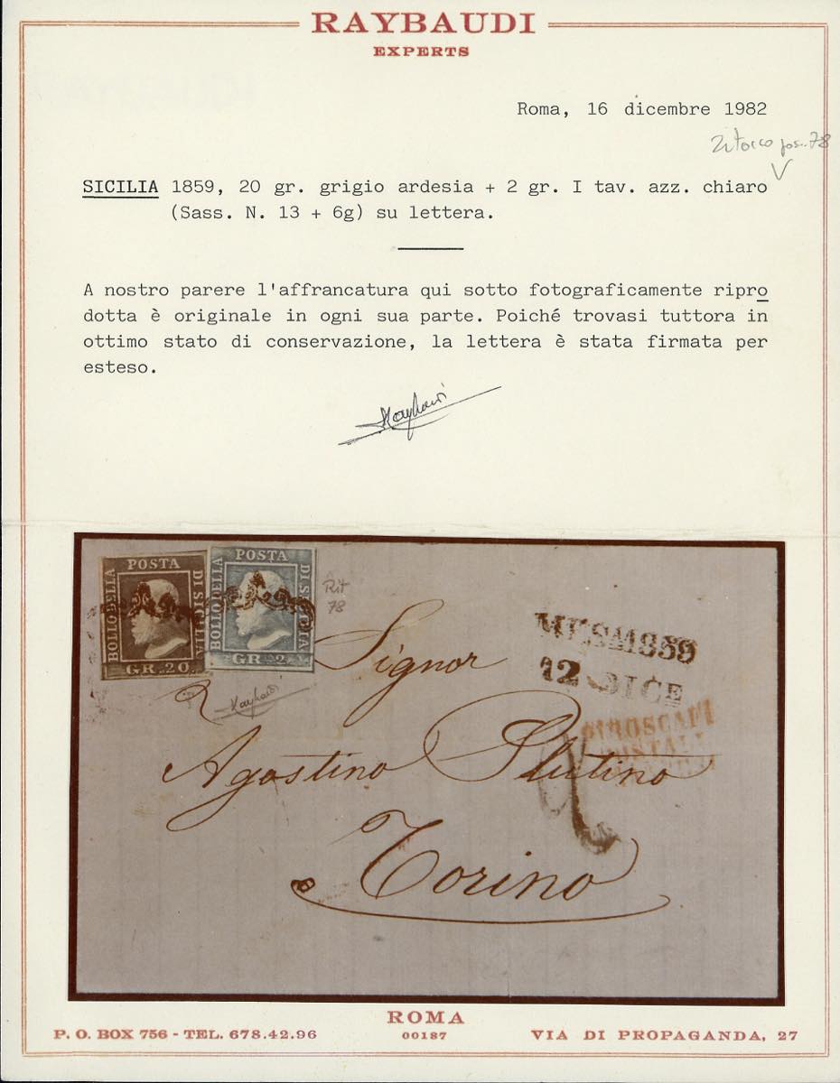 1859 - 20 grana grigio ardesia, 2 grana azzurro chiaro, I tavola, posizione 78 con ritocco (13,6g), perfetti, su lettera da Messina 12/12/1859 a Torino, sul fronte bollo "Piroscafi postali Francesi" in rosso e tassa 20 cent. Molto bella. Colla, cert. Raybaudi e Ferrario. Ex coll. Imperato.
