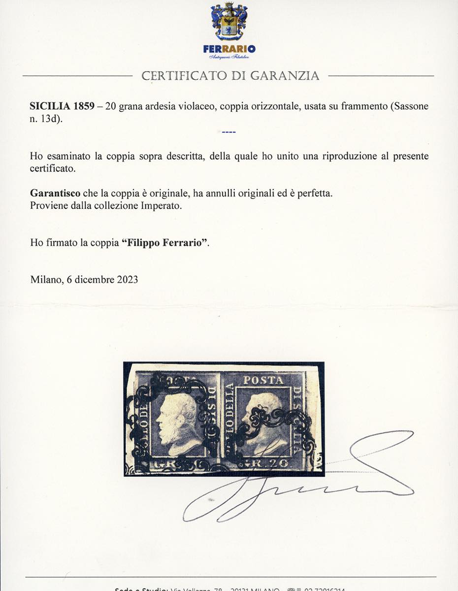 1859 - 20 grana ardesia violaceo (13d), coppia orizzontale, bordo di foglio a destra, perfetta e ben marginata, usata su piccolo frammento. Chiavarello, cert. Ferrario. Ex coll. Imperato.