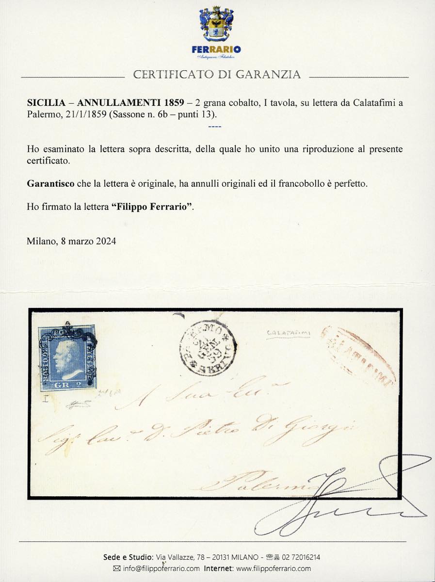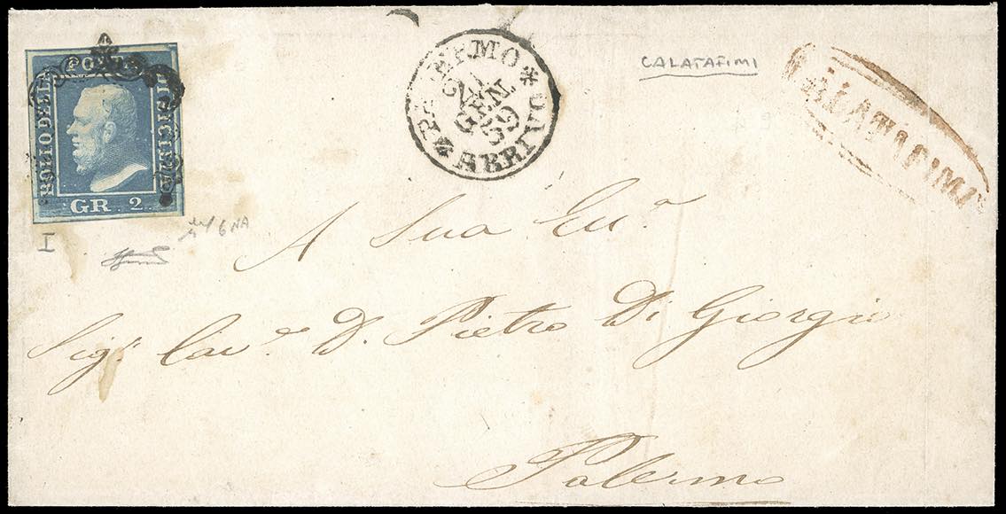 CALATAFIMI, punti 13 - 2 grana (6b), perfetto e ben marginato, su lettera per Palermo 21/1/1859. Chiavarello, cert. Ferrario. Ex coll. Imperato.