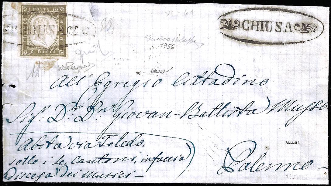 CHIUSA, ovale con fregi punti R1 - 10 cent. (14C), perfetto, su frontespizio di lettera del giugno 1861 per Palermo. Bellissimo e raro! G.Bolaffi, Emilio e A.Diena, ex collezione Nino Aquila. (cat. € 17.500 per lettera completa).