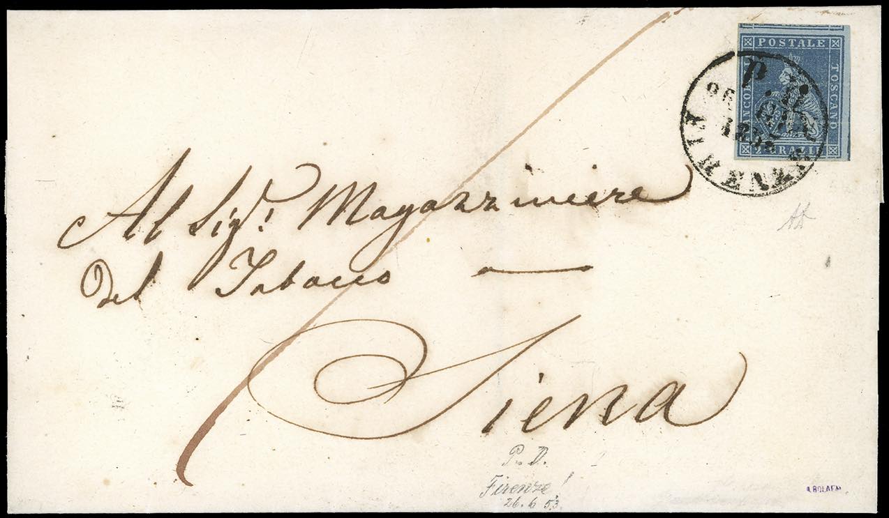 1853 - 2 crazie azzurro grigio su azzurro (5a), parziale riga di riquadro verticale nel margine di foglio a destra, perfetto e ben marginato su tutti i lati, su fresca lettera da Firenze 26/6/1853 a Siena. Splendida e rara. Alberto Diena.