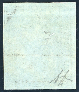 1851 - 6 crazie azzurro scuro su azzurro (7c), tre margini eccezionali, perfetto, annullato con leggero muto "a ragno", principio di riga di colore nel margine di sinistra in alto. Molto bello e di grande freschezza. A.Diena.