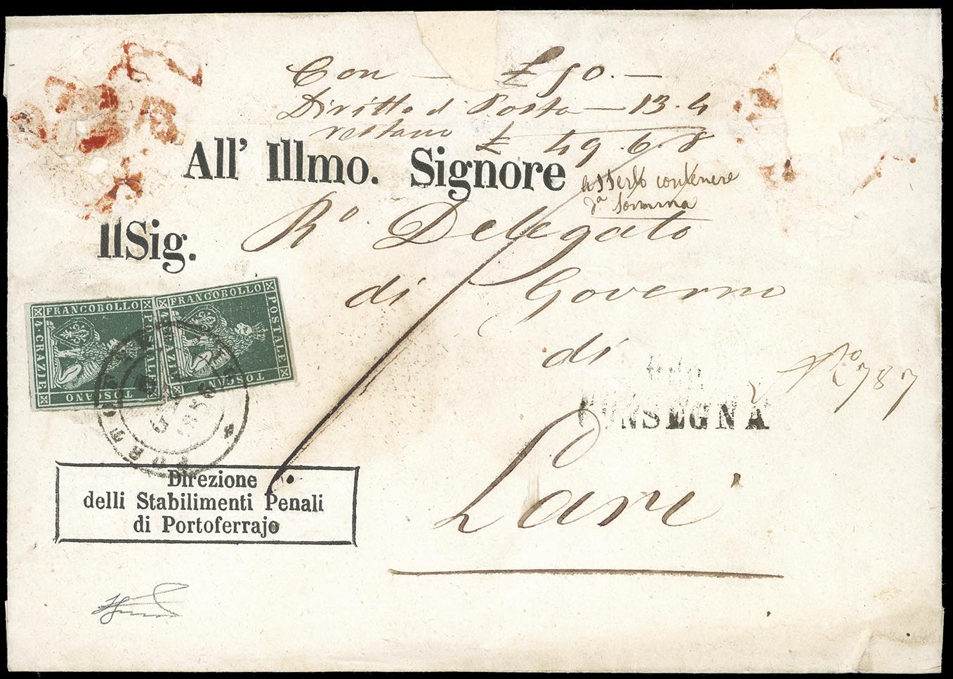 1856 - 4 crazie verde su grigio (4), due esemplari in ottimo stato, su assicurata da Portoferrario 3/1/1856 a Lari, contenente denaro come da indicazione manoscritta "con L.50, Diritto di Posta 13.4, restano L. 49.6.8". Insieme raro, pochi esistenti. Ferrario. Ex coll. Imperato.