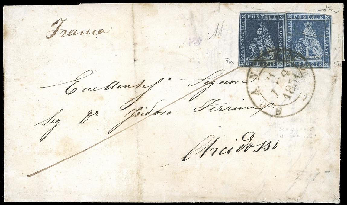 1851 - 6 crazie indaco su azzurro, 2 crazie azzurro grigio su azzurro (7a,5a), il primo perfetto, il secondo corto in alto a destra, su lettera da Scansano 11/7/1851 ad Arcidosso. Non comune porto multiplo per l'interno.