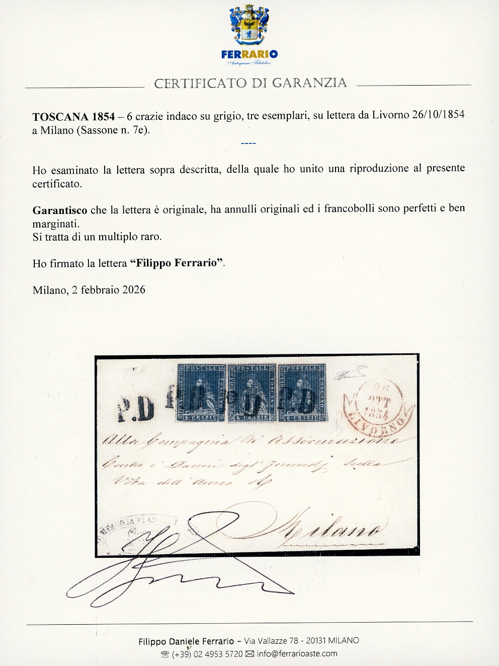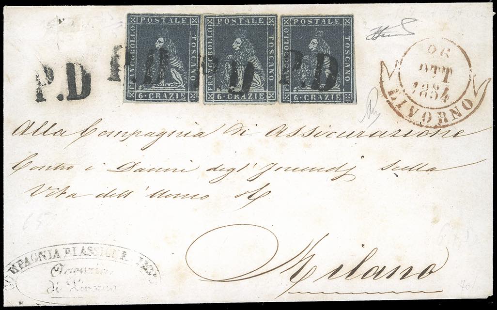 1854 - 6 crazie indaco su grigio (7e), tre esemplari perfetti, su lettera da Livorno 26/10/1854 a Milano. Raro multiplo, specialmente con gli esemplari ben marginati. Cert. Ferrario.