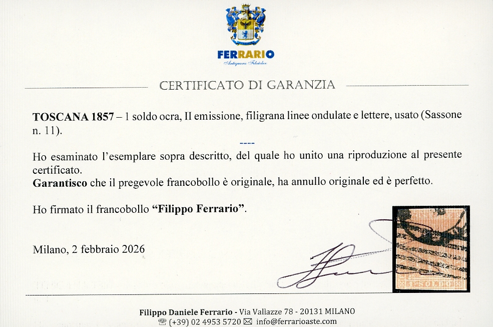 1857 - 1 soldo ocra, II emissione (11), usato, perfetto. Raro. Em.Diena, G.Oliva, cert. Ferrario.