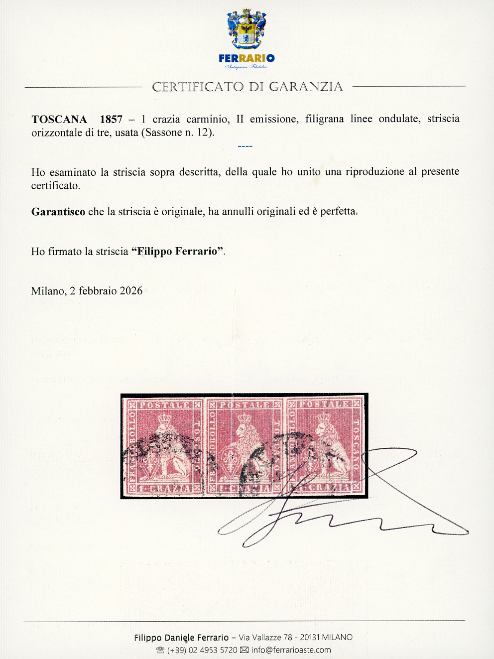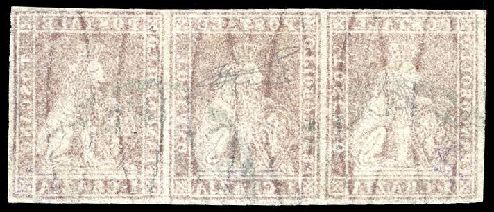 1857 - 1 crazia carminio, II emissione (12), striscia orizzontale di tre, usata, perfetta. Molto fresca. Cert. Ferrario.