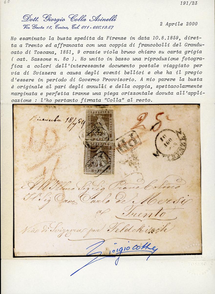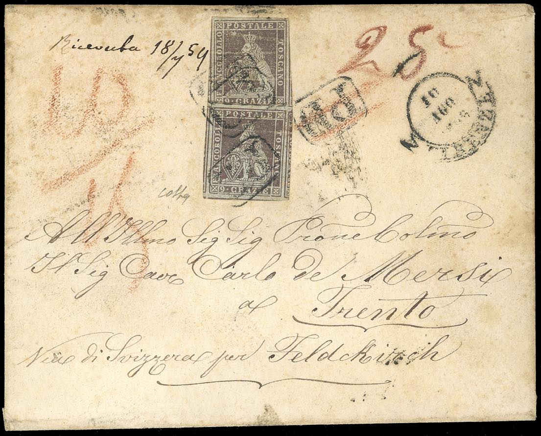 1859 - 9 crazie bruno violaceo chiaro su grigio, I emissione (8c), coppia verticale con margini eccezionali, piccola grinza d'applicazione al centro, su lettera da Firenze 10/8/1859 a Trento, transitata per la via di Svizzera e con segni di tassa sul fronte. Interessante e rara. Cert. Colla. Ex coll. Imperato.