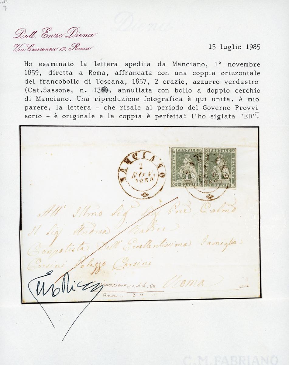 1859 - Lettera da Manciano per Roma del 1 novembre 1859 affrancata in tariffa di 4 crazie per lettere via di terra per la seconda distanza, dirette nello Stato Pontificio, con coppia del 2 crazie verde su bianco (13a) annullata con bollo a doppio cerchio di Manciano, al verso bollo di arrivo di Roma del 3 novembre. Molto bella, coppia perfetta, ben marginata. Raro uso in Governo Provvisorio. Cert. E.Diena.
