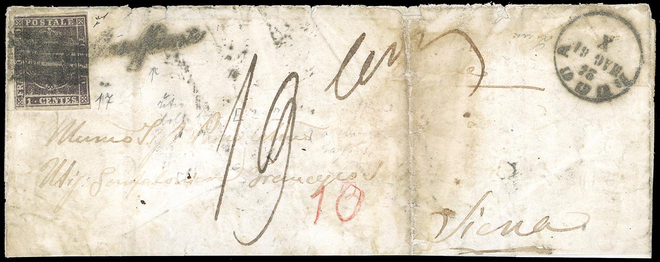 1861 - 1 cent. violetto bruno (17), corto a sinistra, isolato su lettera da Lucca 24/5/1861 a Siena. Il tentativo in frode di utilizzare un francobollo da 1 cent in luogo di quello da 10 cent., di colore simile, venne scoperto e la lettera venne tassata per 19 cent., pari al doppio della tariffa dovuta diminuita dell'affrancatura effettivamente applicata. Insieme molto interessante e raro, probabilmente unico. Chiavarello. Ex coll. Imperato.