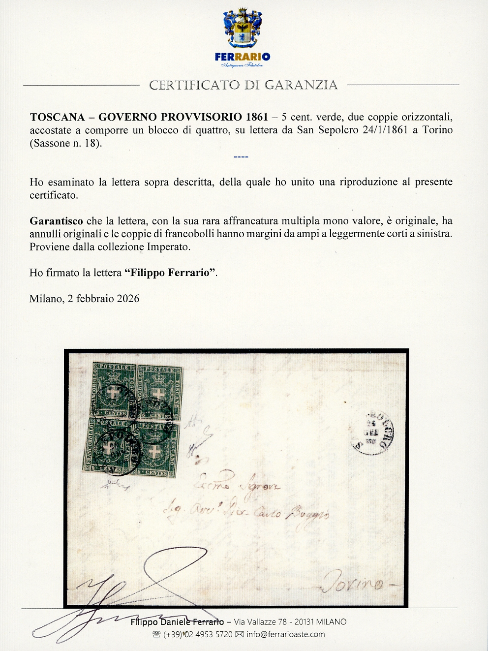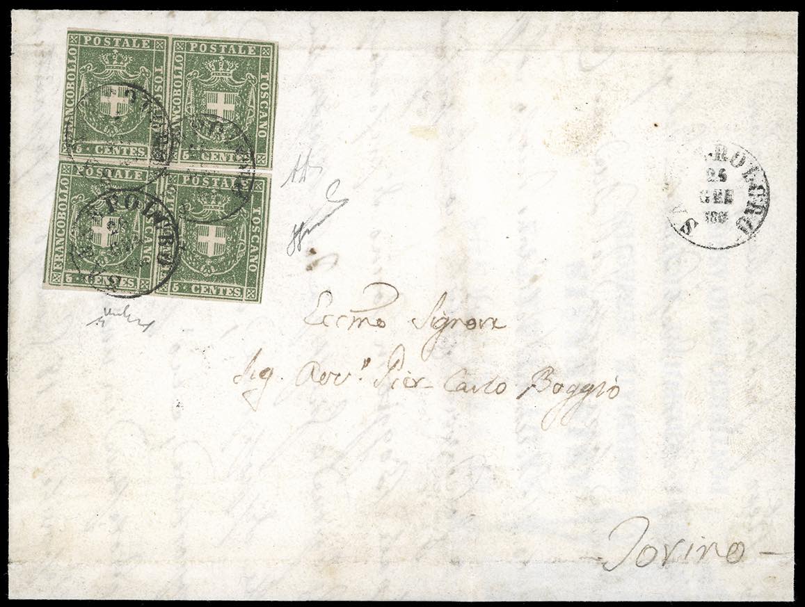 1861 - 5 cent. verde (18), due coppie orizzontali, accostate a comporre un blocco di quattro, margini da ampi a leggermente corti a sinistra, su lettera da San Sepolcro 24/1/1861 a Torino. Multiplo molto raro e di grande effetto. A.Diena, Chiavarello, cert. Ferrario.