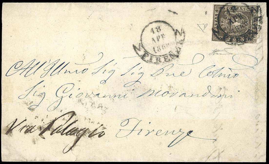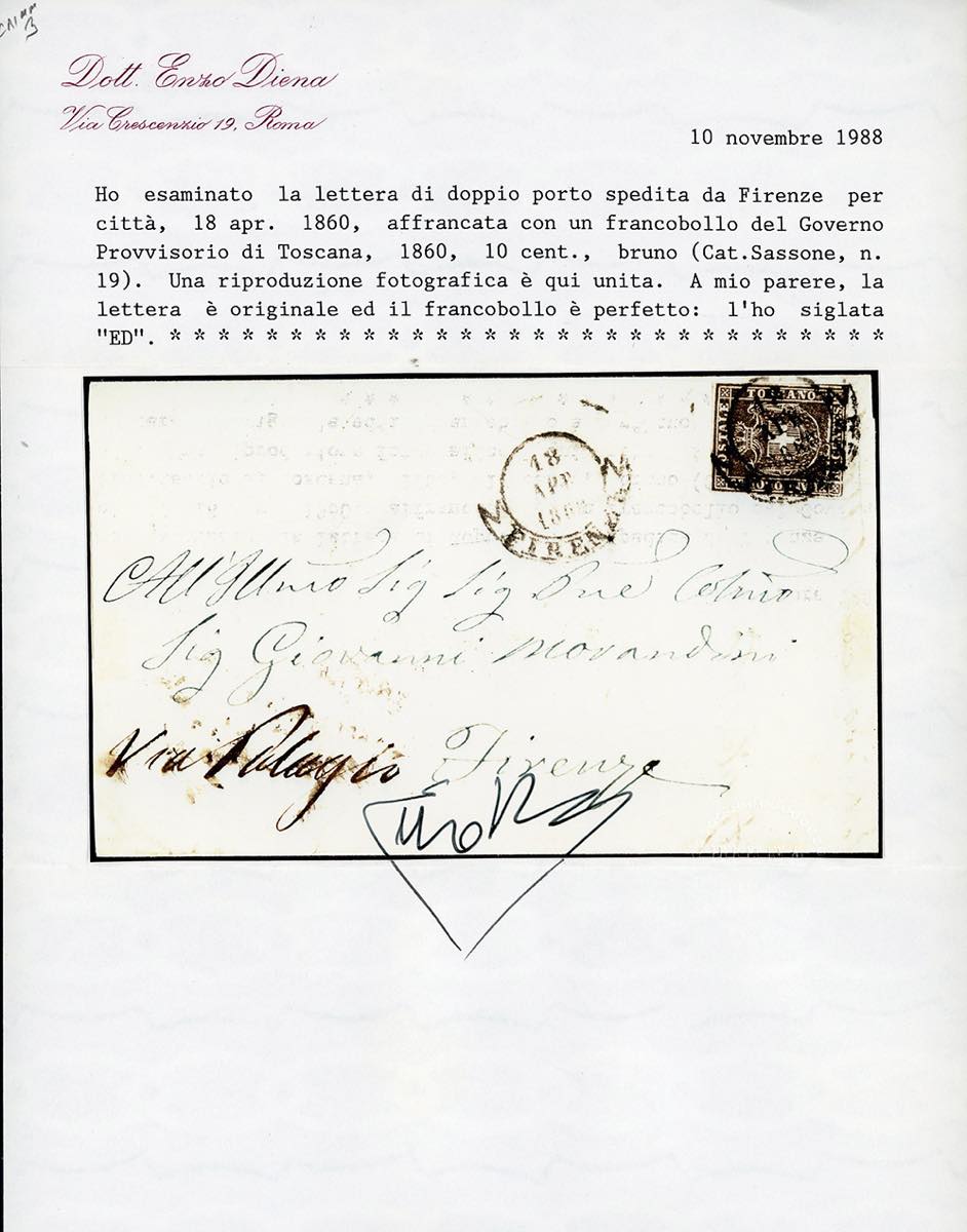 1860 - 10 cent. bruno (19), perfetto e ben marginato, isolato su lettera di doppio porto, 5 cent. x2, da Firenze 18/4/1860 per città. PORTO MULTIPLO PER CITTA' MOLTO RARO, di ottima qualità. Cert. E.Diena.