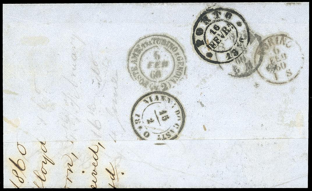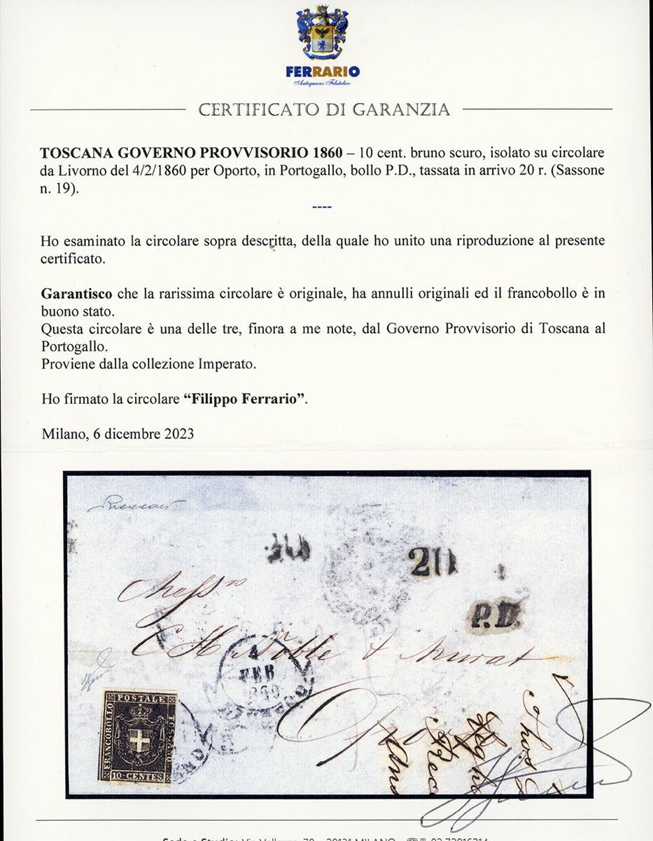 1860 - 10 cent. bruno (19), un po' corto a destra, tre ottimi margini, eccezionalmente in uso isolato su circolare per l'estero, da Livorno 4/2/1860 ad Oporto in Portogallo, tassata in azzurro 20 r. Rarissima e pochissimi casi noti. Vaccari, cert. Ferrario. Ex collezione Imperato.