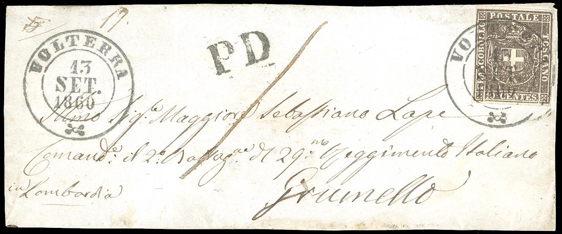 1860 - Frontespizio di lettera da Volterra a Grumello (Lombardia) del 13/9/1860, affrancata in TARIFFA RIDOTTA PER MILITARI con 10 centesimi (19), perfetto, bollo PD sul fronte. Interessante e rara.