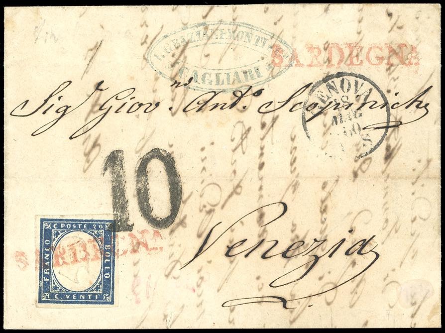 1860 - Lettera da Cagliari a Venezia del 12/5/1860 affrancata con 20 centesimi azzurro della IV emissione di Sardegna (15Ca), annullato in transito a Genova col bollo in rosso “Sardegna” (punti 9), bollo di tassa 10 soldi sul fronte.