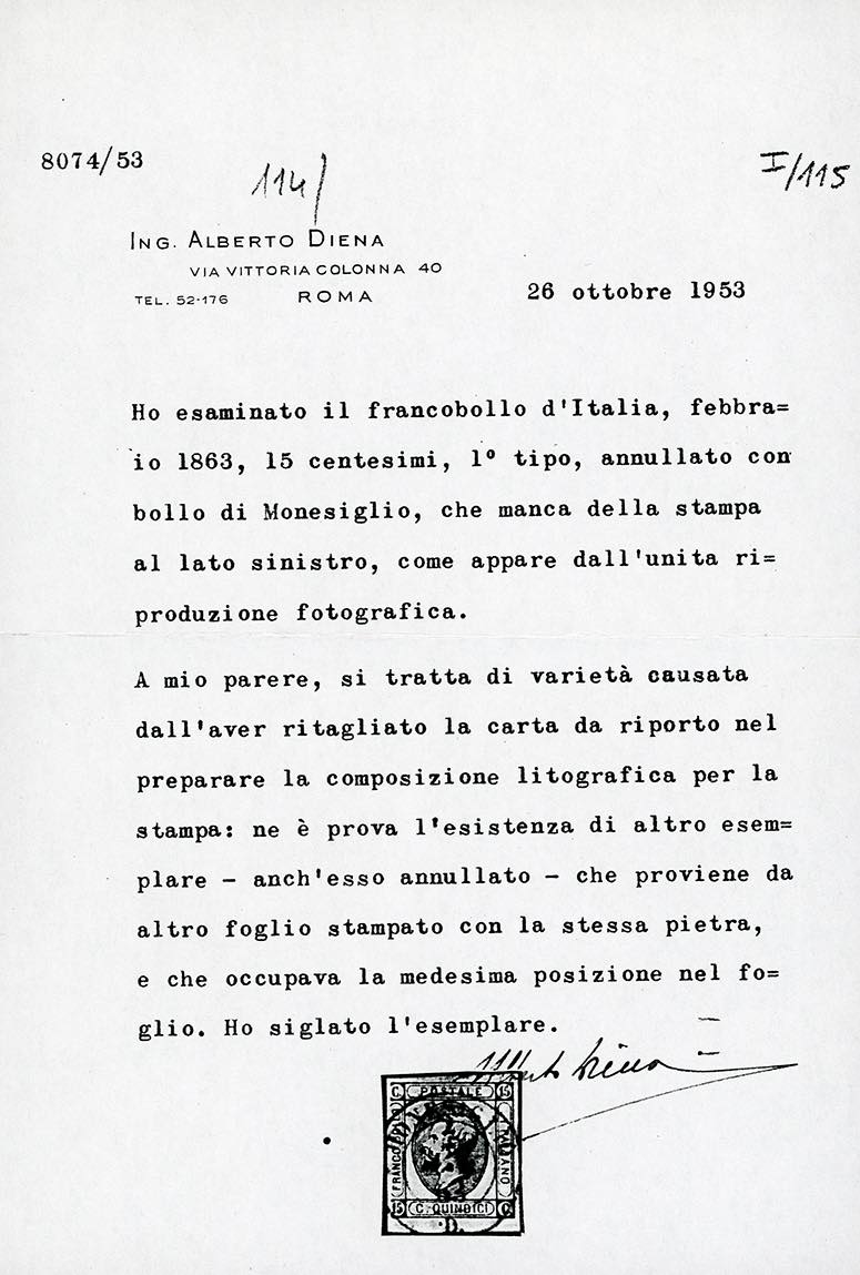1863 - 15 cent. Litografico, I tipo, SENZA LA STAMPA DI RIQUADRO A SINISTRA (12fa), perfetto, usato a Monesiglio. Rarissimo, DUE SOLI ESEMPLARI NOTI. Fotocopia cert. Diena e Ferrario.