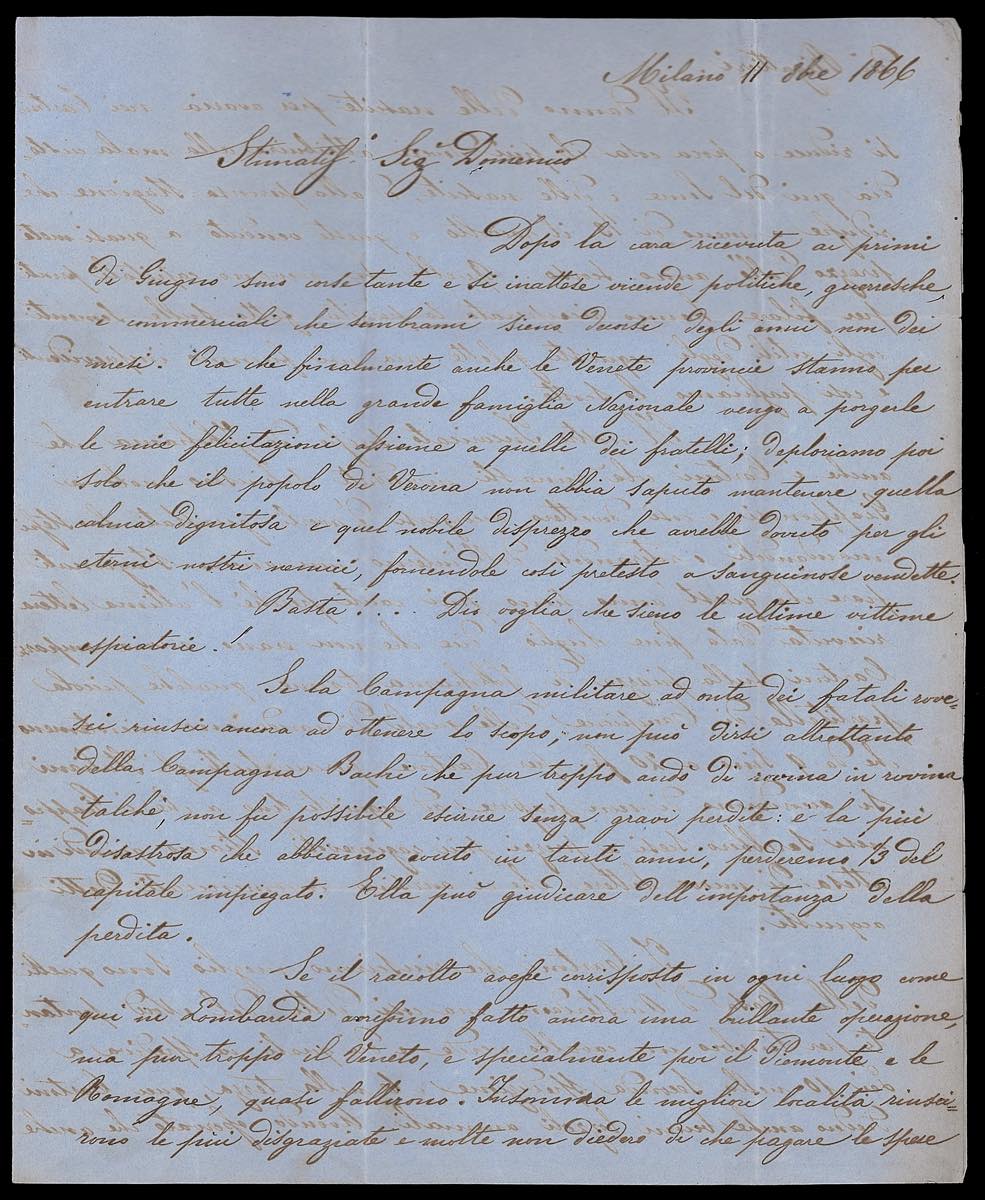 1866 - 10 cent. De La Rue, tiratura di Londra (L17), coppia verticale, parzialmente separata con le forbici, su lettera insufficientemente affrancata da Milano 11/10/1866 a Bussolengo, sul fronte il lineare "credito italiano cent" 8 e tassa 9. Interessante testo storico.
