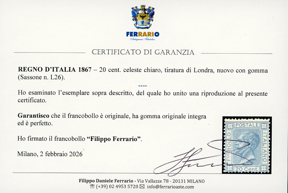 1867 - 20 cent. celeste chiaro, tiratura di Londra (L26), nuovo, gomma originale integra, perfetto. A.Diena, G.Oliva, cert. Ferrario.