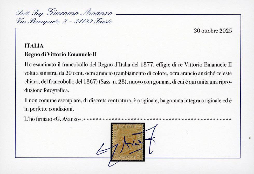 1877 - 20 cent. ocra arancio (28), discreta centratura, gomma originale integra, perfetto. A.Diena, cert. Avanzo.
