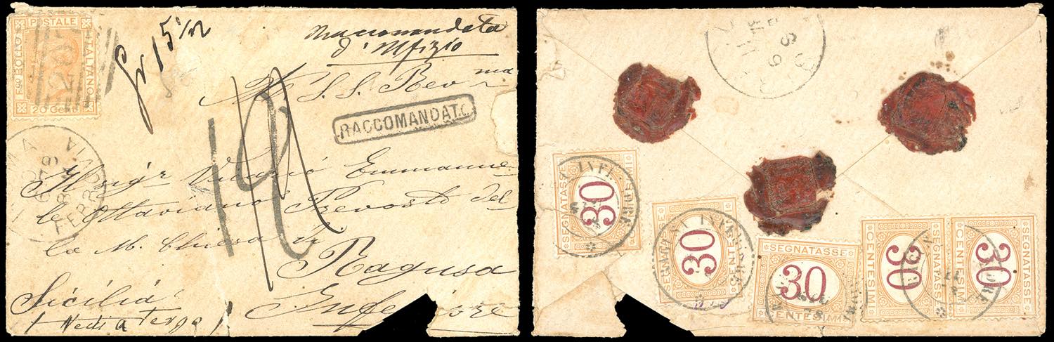 1878 - 20 cent. ocra arancio (28), su busta da Roma 10/6/1878 a Ragusa Inferiore. La busta con ogni probabilità conteneva denaro e venne raccomandata d'ufficio, come da indicazione manoscritta sul fronte, con applicazione al verso di cinque segnatasse da 30 cent. ocra e carminio (7), a rappresentare la tassa dovuta manoscritta sul fronte. Interessante e raro oggetto di storia postale.