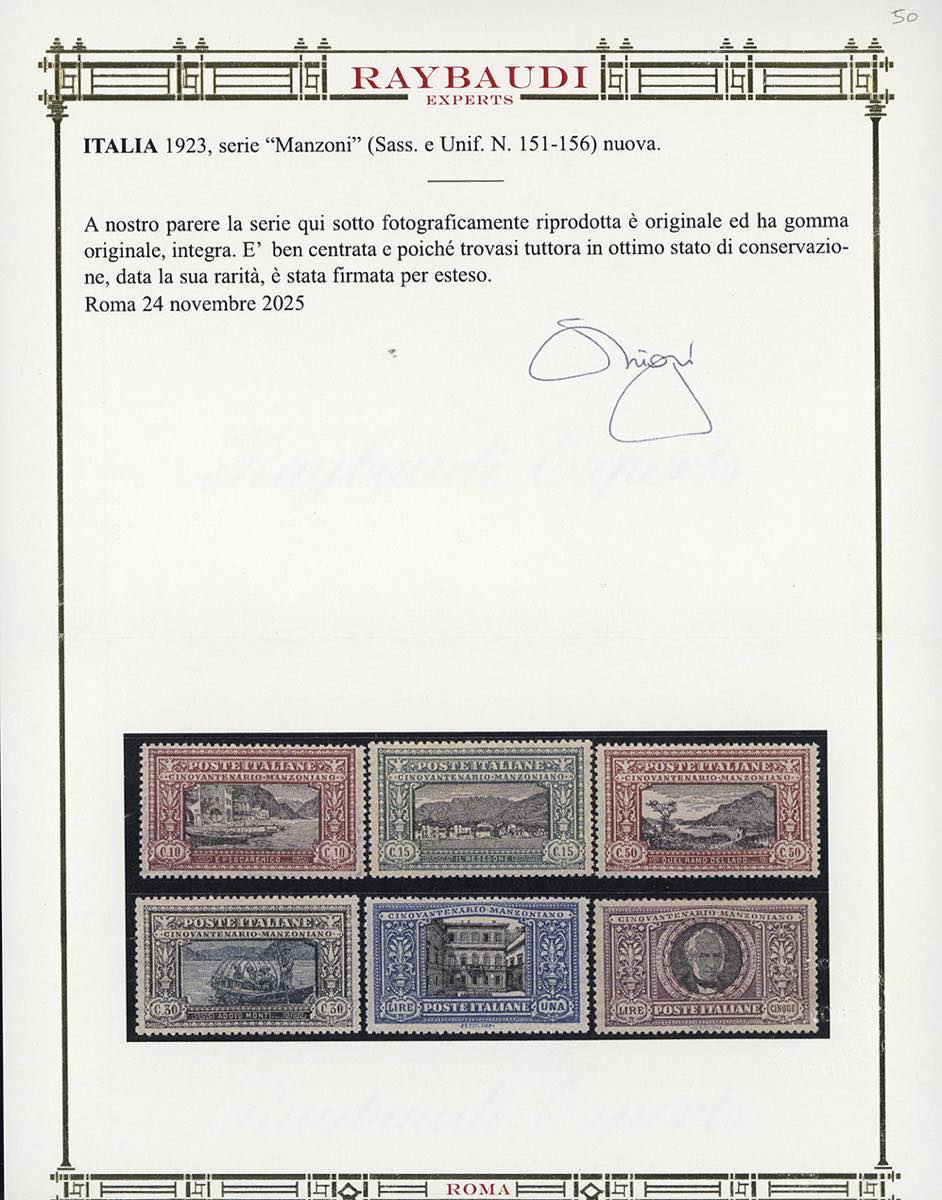 1923 - Manzoni, serie completa (151/156), ben centrati, nuovi, gomma originale integra, perfetti e molto freschi. A.Diena per il 5 lire, cert. Oro Raybaudi per la serie.