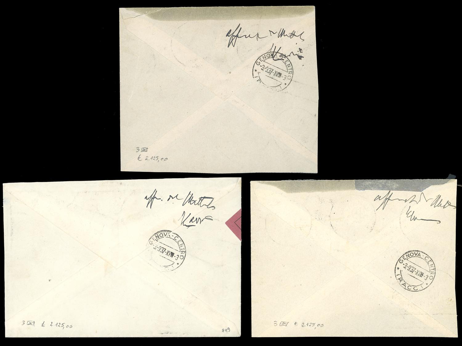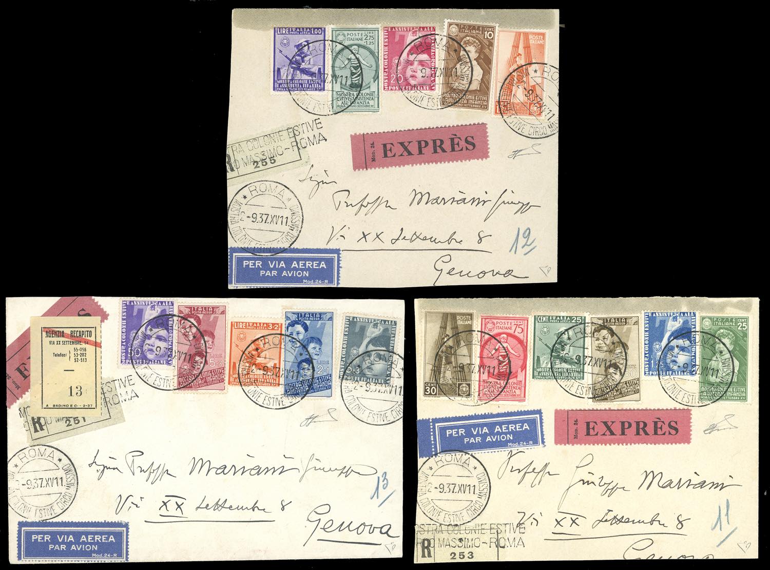 1937 - Colonie Estive, serie completa (406/15+ A100/A105), su tre aerogrammi raccomandati da Roma 2/9/1937 a Genova, bolli d'arrivo al ... Leggi tutto