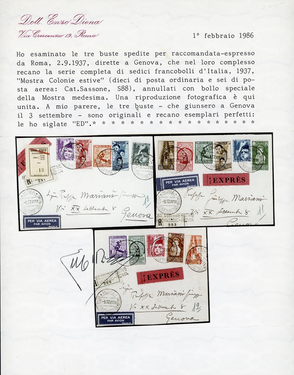 1937 - Colonie Estive, serie completa (406/15+ A100/A105), su tre aerogrammi raccomandati da Roma 2/9/1937 a Genova, bolli d'arrivo al verso. Insieme raro. Ferrario, cert. E.Diena 1986.