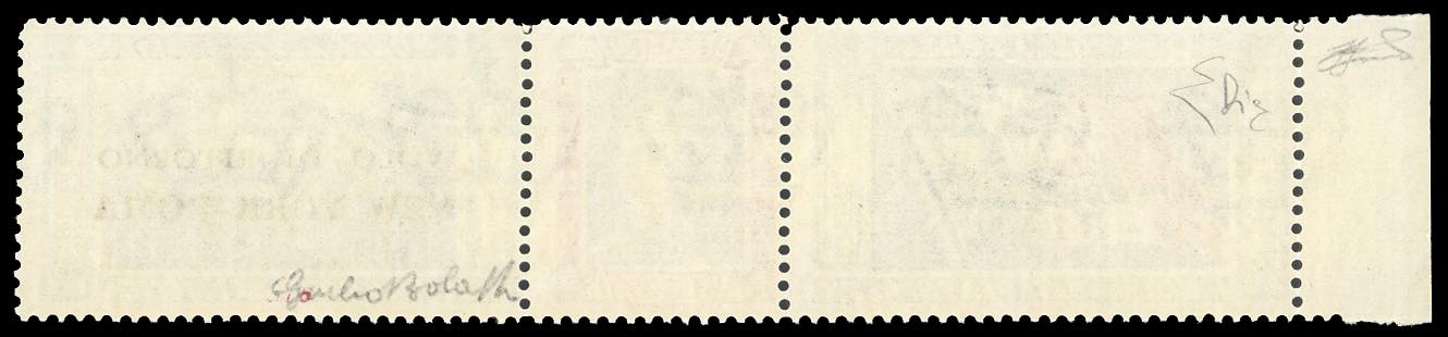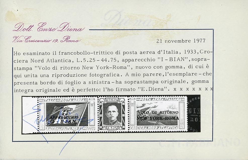 1933 - 5,25 + 44,75 lire Trittico I-BIAN, soprastampato "VOLO DI RITORNO", non emesso (53), bordo di foglio a sinistra, nuovo, gomma originale integra, perfetto e molto fresco. E' uno dei 25 esemplari soprastampati con questa sigla. Rarità. Giulio Bolaffi, cert. Ferrario ed Enzo Diena 1977.