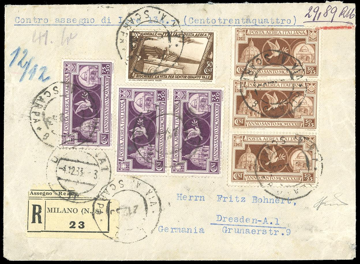 1933 - Anno Santo, tre serie complete, e 50 cent. Marcia su Roma posta aerea (54/55,42), perfetti, su busta raccomandata in contrassegno da Milano 4/12/1923 per la Germania.