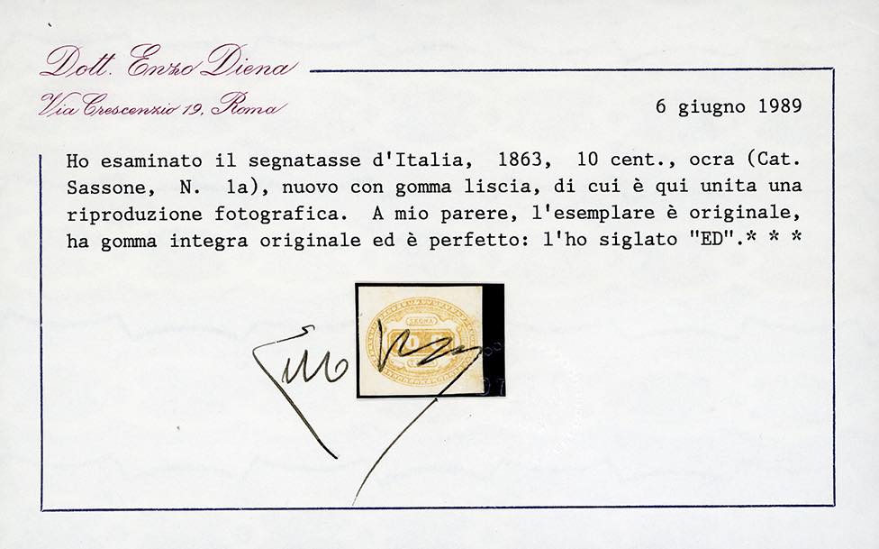 1863 - 10 cent. ocra (1), nuovo, gomma originale integra, perfetto, due piccolissimi puntini di ruggine al verso. Cert. E.Diena.