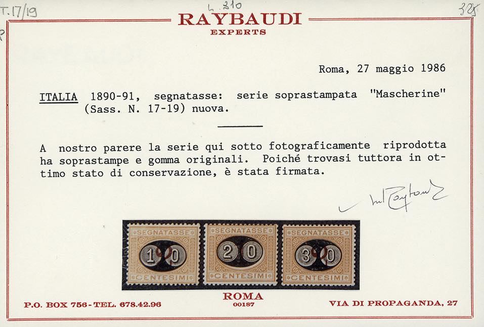 1890/1891 - Mascherine, soprastampati, serie completa (17/19), nuovi, gomma originale, leggera traccia di linguella, perfetti. Il 30 cent. ben centrato. G.Oliva, cert. Raybaudi.